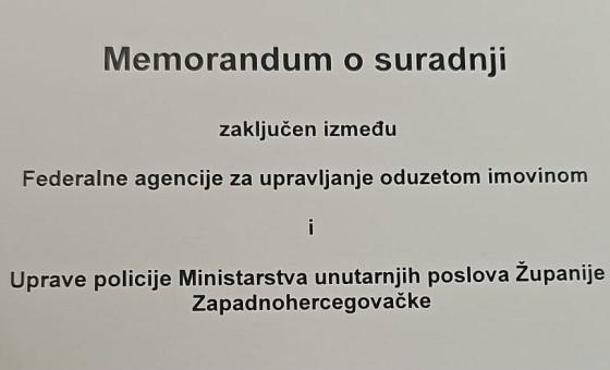 Danas je u Neumu potpisan Memorandum o suradnji između Federalne agencije za upravljanje oduzetom imovinom i Uprave policije Ministarstva unutarnjih poslova Županije Zapadnohercegovačke. Memorandum je potpisan u okviru događaja organiziranog uz potporu United Nations Office on Drugs and Crime (UNODC), na kojem je predstavljena Strategija za oduzimanje imovinske koristi pribavljene kaznenim djelom u Federaciji BiH za razdoblje 2025.–2031., kao i digitalni katalog oduzete imovine. Cilj Memoranduma je jačanje suradnje institucija u području financijskih istraga, oduzimanja i upravljanja nezakonito stečenom imovinom, uz naglasak na razmjenu informacija i unapređenje institucionalnih kapaciteta. Predstavljena Strategija predstavlja prvi sveobuhvatni dokument ove vrste u FBiH, usmjeren na razvoj učinkovitog i transparentnog sustava oduzimanja nezakonito stečene imovine.